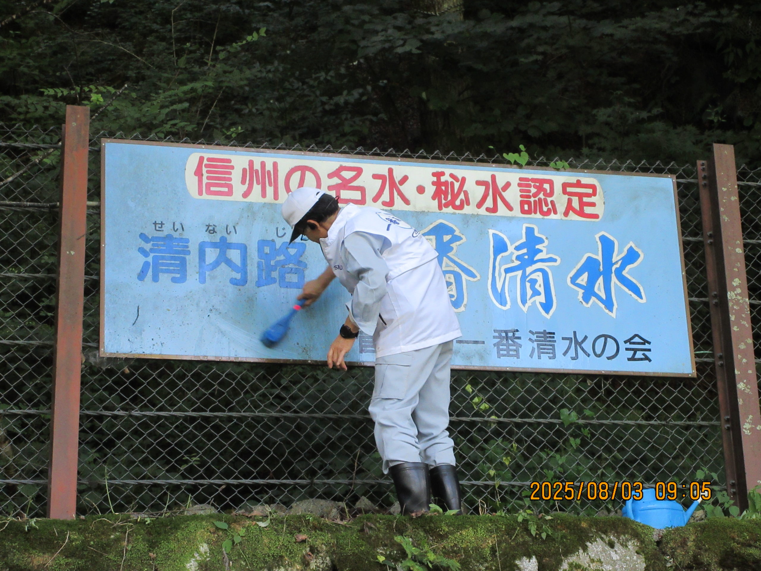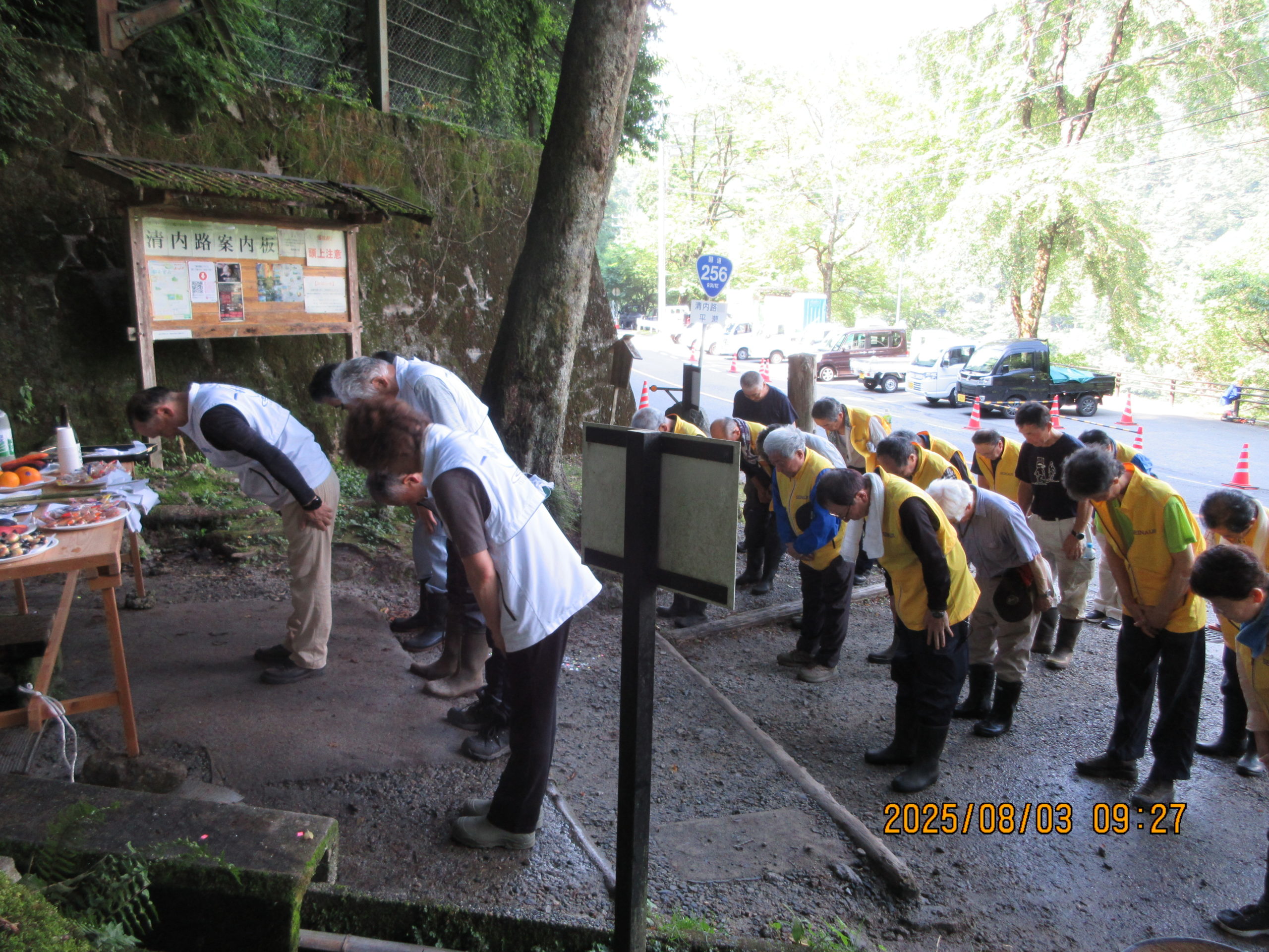 【一番清水】環境整備の報告とお礼 HIROBA向けニュース 2025.08.05 去る8月3日(日)一番清水の会会員による、環境整備作業を行いました。 また、作業終了後には水神祭も併せて開催しました。 無事に一連の作業・行事を終了する事ができました。ご利用くださる皆様方のご協力に感謝申し上げます。 ご協力ありがとうございました。 一番清水の会 2025一番清水の会 環境整備作業 取水口の整備 看板の清掃 水神祭